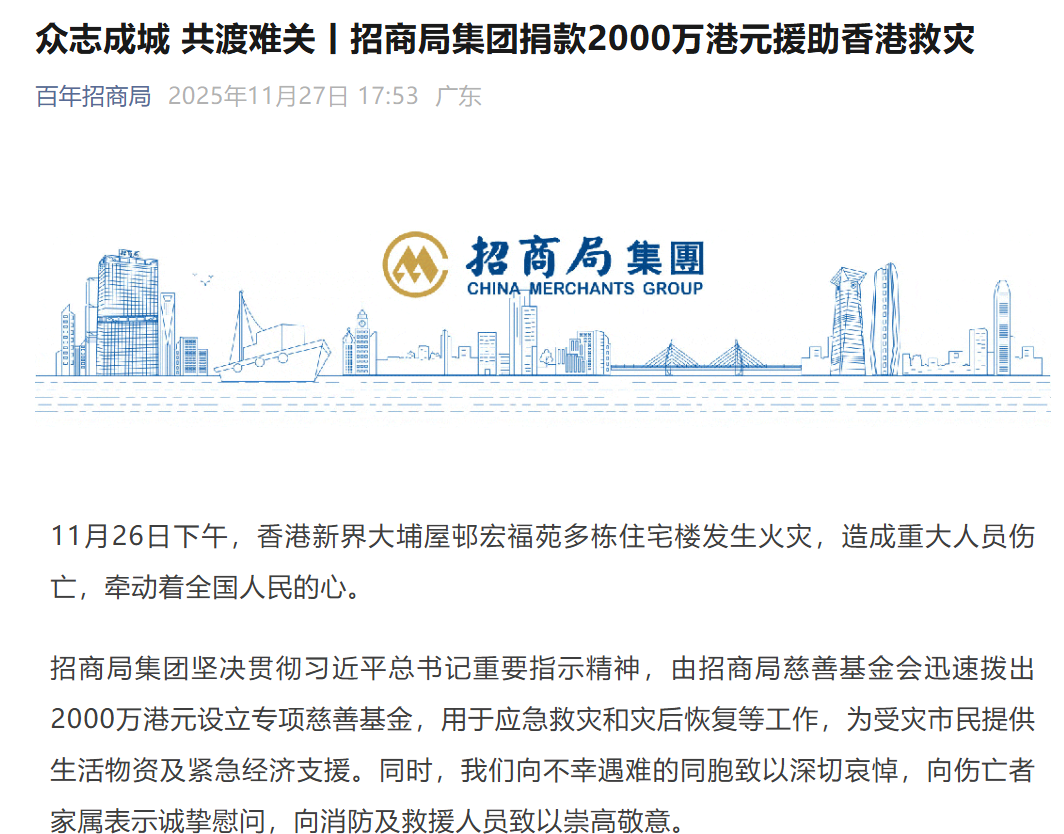 11月27日,招商局集团发布公告称,针对香港大埔火灾,由招商局慈善基金会迅速拨出2000万港元设立专项慈善基金,用于应急救灾和灾后恢复等工作,为受灾市民提供生活物资及紧急经济支援。同时,我们向不幸遇难的同胞致以深切哀悼,向伤亡者家属表示诚挚慰问,向消防及救援人员致以崇高敬意。